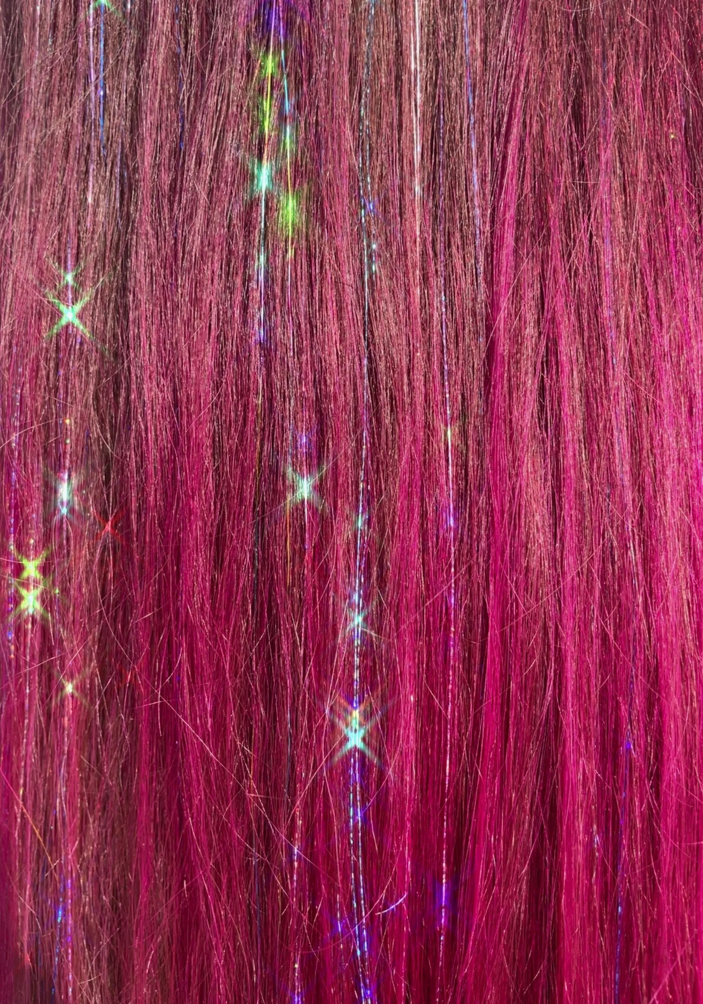 Fairy Hair is a delicate strand of shimmering tinsel tied securely to a single strand of your natural hair. It moves, washes, styles, and even heat-treats just like your own hair—without damage. Available in a rainbow of colors, it’s the perfect way to add sparkle for special events or everyday fun.